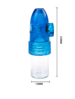 Snuff dispensers with straight hole dispensing mechanism made of coloured acrylic and with short (2 cm) clear glass storage bottle screwed in.