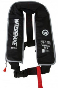 The Watersnake PFD Inflatable Life Jacket is designed to fold flat for easy storage and has a manual inflation system easily activated by pulling down on the toggle to initiate the release of the 33g CO2 gas cylinder. Plus, there's also a mouthpiece for oral inflation.