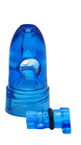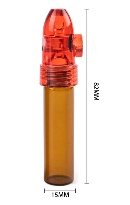 Snuff dispensers with straight hole dispensing mechanism made of coloured acrylic and with long (4 cm) clear or brown glass storage bottle screwed in.
