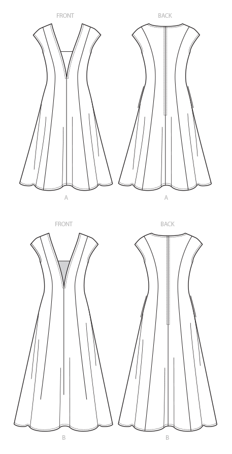 Close fitting dress has princess seams, back zipper, length variations, and dickey that attaches to dress with snaps.