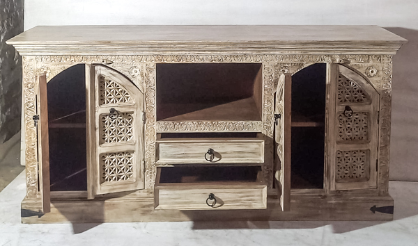 A beautiful sideboard made from reclaimed timber and sustainable mango wood with gorgeous lattice doors and hand carved detailing. Use as a TV cabinet or low sideboard.