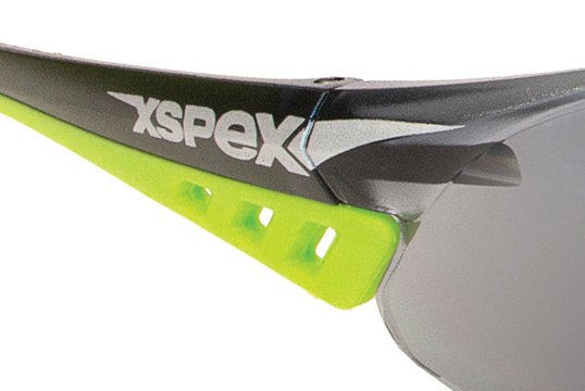 XSPEX Safety Spec, wraparound style, soft rubber sidearms, anti-fog and anti-scratch coating