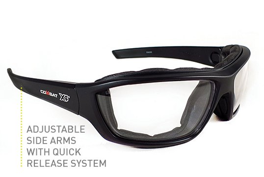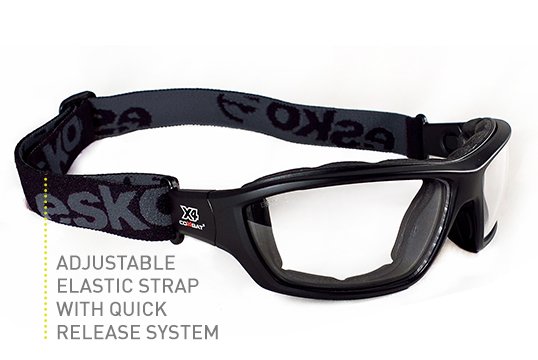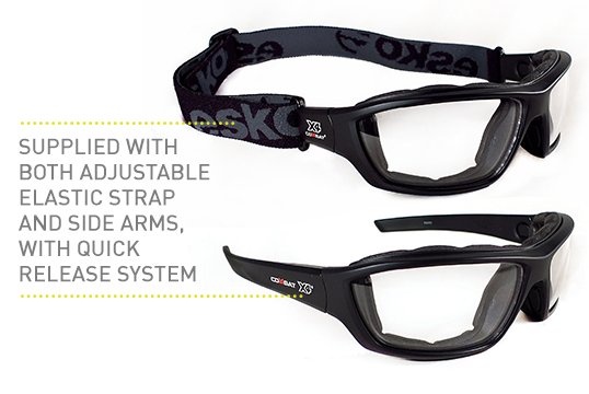 - Supplied with both adjustable elastic strap or side arms - quick release system