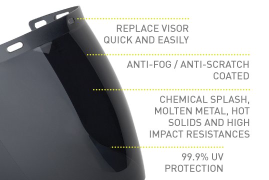 - Chemical splash, molten metal, hot solids and high impact resistances