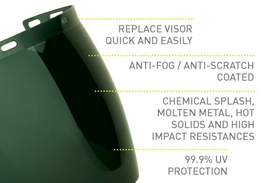 - Chemical splash, molten metal, hot solids and high impact resistances