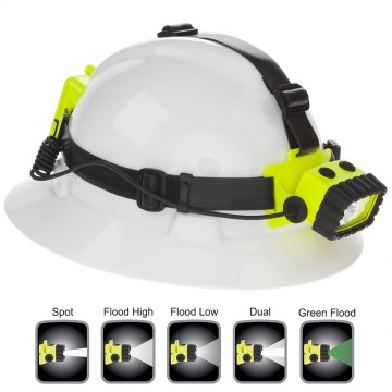 This Dual-Light' Multi-function Headlamp is cETLus, ATEX, IECEx and MSHA listed Intrinsically Safe Permissible for use in hazardous situations. The headlamp features a multi-position tilt head design, a rear-mounted battery compartment and includes both an elastic head strap with a non-slip lining and a heavy-duty rubber strap for use with hard hats. The top mounted dual switches provide spotlight, full-power white floodlight, half-power white floodlight and green low beam night vision operation.