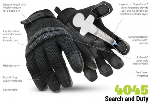 Search and Duty gloves Gloves feature reinforced fingertips, as well as an interior layer designed from SuperFabric material. This makes the gloves cut resistant and practical for handling sharp objects as well as needlestick risk.