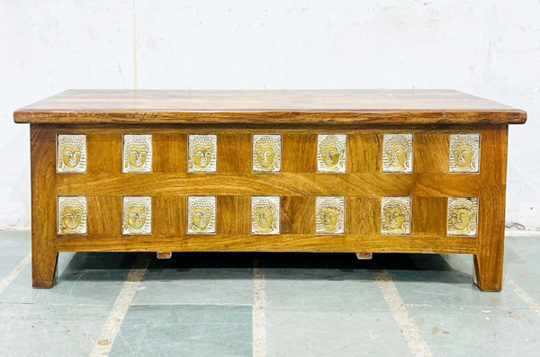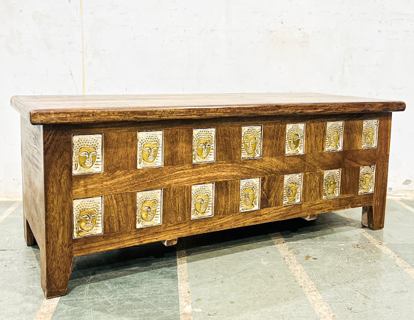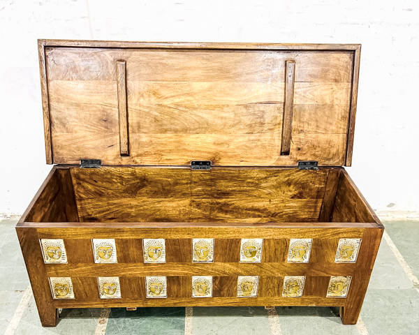 A wonderful handcrafted blanket box made from beautiful mango wood with brass covered images of buddha. Would make a wonderful coffee table with storage.