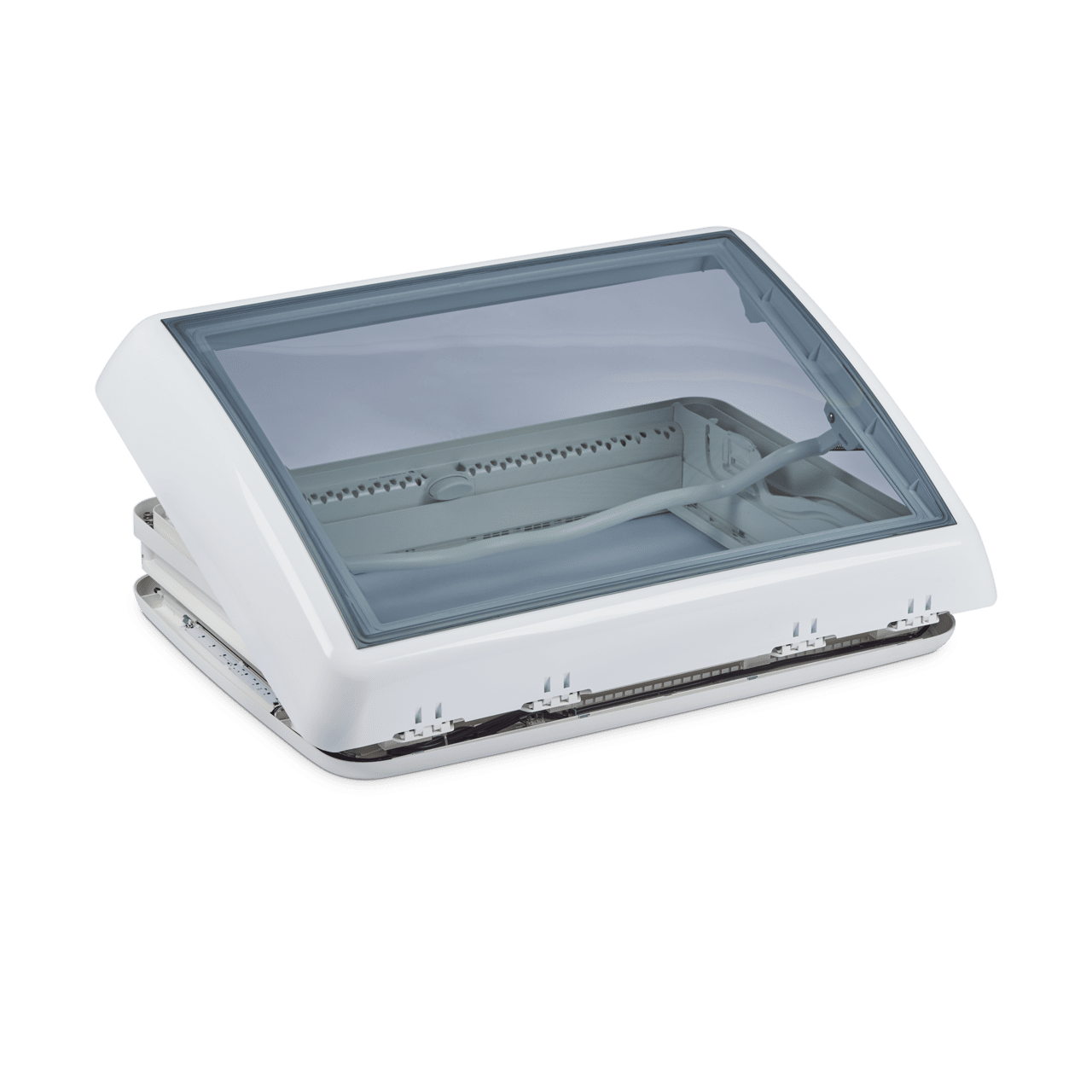 Operating bar opens in three positions: completely open, half open and bad weather position. With the glass overlapping on the sides no water can splash inside when the dome is in bad weather position.