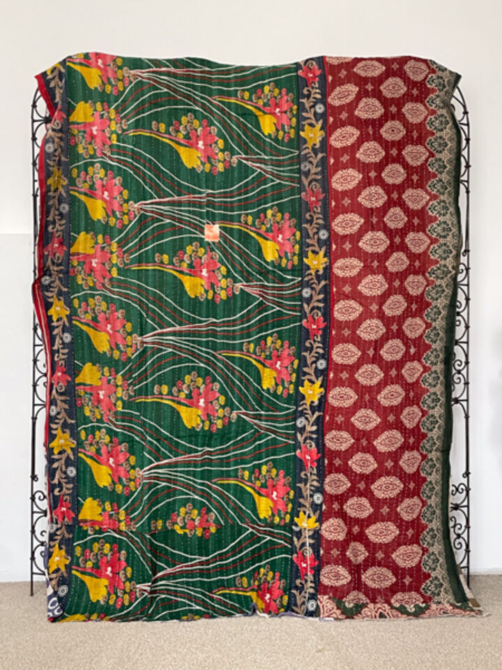 These vintage kantha quilts are a thin, double sided cotton quilt hand crafted in Rajasthan. They are made from old saris, scraps of left over textiles and each one is unique. Most of them will have small patches sewn over to patch small holes. They commonly have some loose or uneven stitching and old stains on the fabric. This is all part of the beauty of a handcrafted vintage kantha. Very awesome quilts!!
