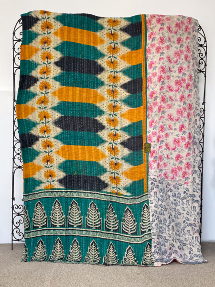 These vintage kantha quilts are a thin, double sided cotton quilt hand crafted in Rajasthan. They are made from old saris, scraps of left over textiles and each one is unique. Most of them will have small patches sewn over to patch small holes. They commonly have some loose or uneven stitching and old stains on the fabric. This is all part of the beauty of a handcrafted vintage kantha. Very awesome quilts!!
