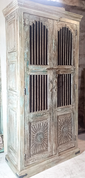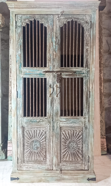 A super rustic tallboy made from reclaimed wood with iron jali doors. Perfect for displaying your favourite treasures. Handcrafted in India.