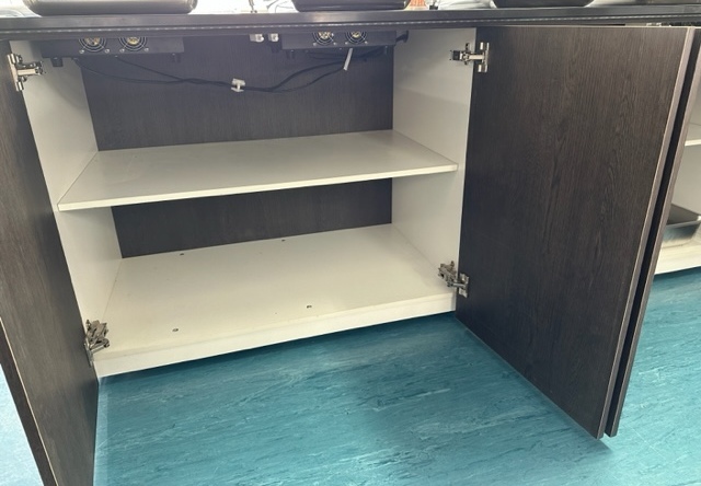 Resilient stone benchtop and walnut wood grain base give this buffet island a luxurious look.