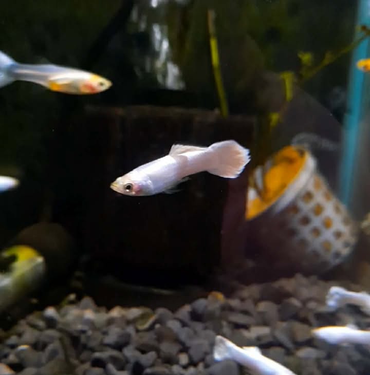 Pair of white platinum guppies. 1 male 1 females.