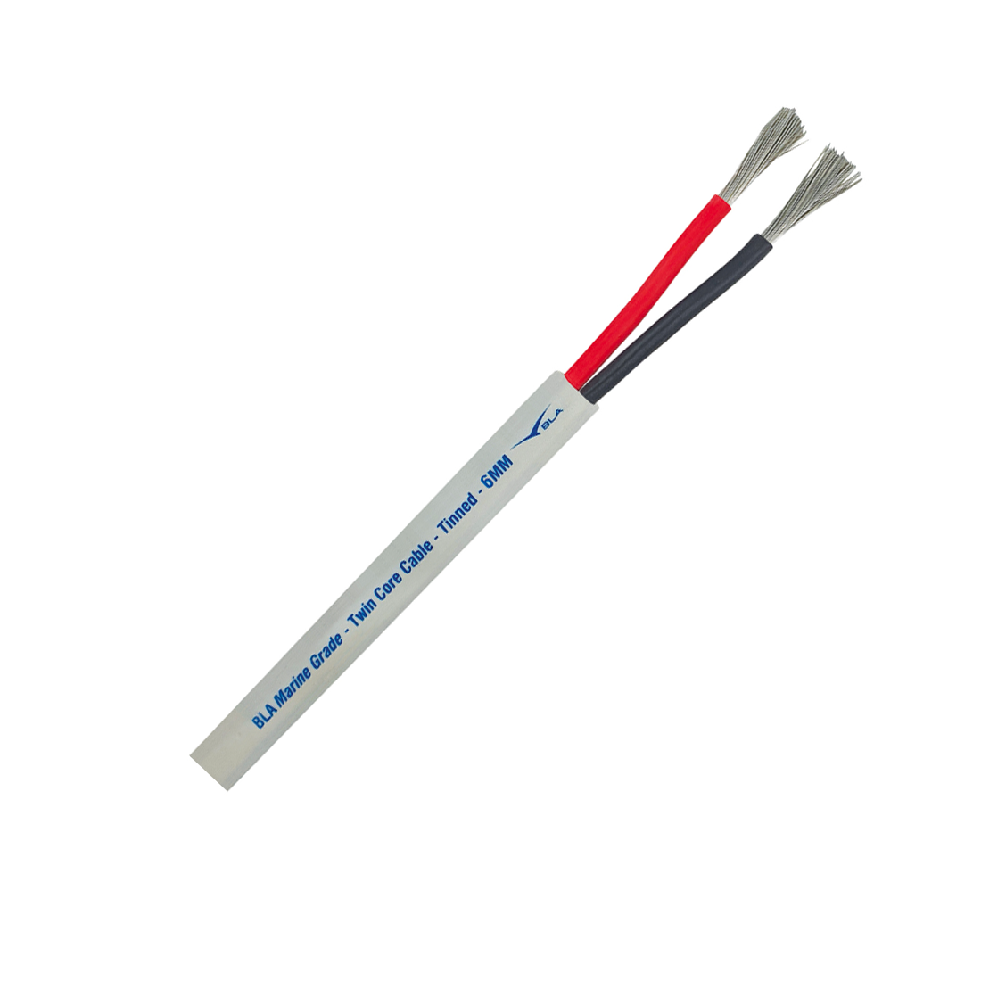 Marine quality, twin core low voltage wiring with external sheath for extra protection in vulnerable applications. V90 PVC insulation and sheath to AS/NZS 3808, tin coated copper wire conductor to AS/NZS 1125. Red/black core with white outer sheath, printed with sizing and metre marks.