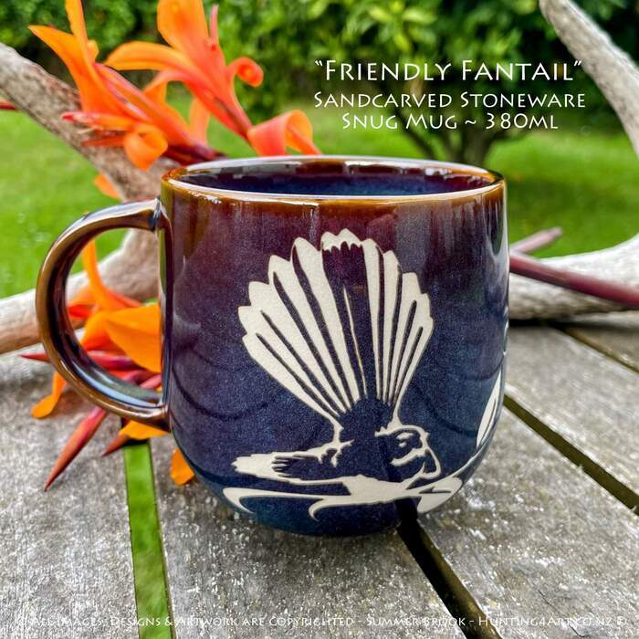 This friendly little Piwakawaka is sure to make you smile! This beautifully crafted hand sandcarved stoneware mug is a great way to start your day off right!