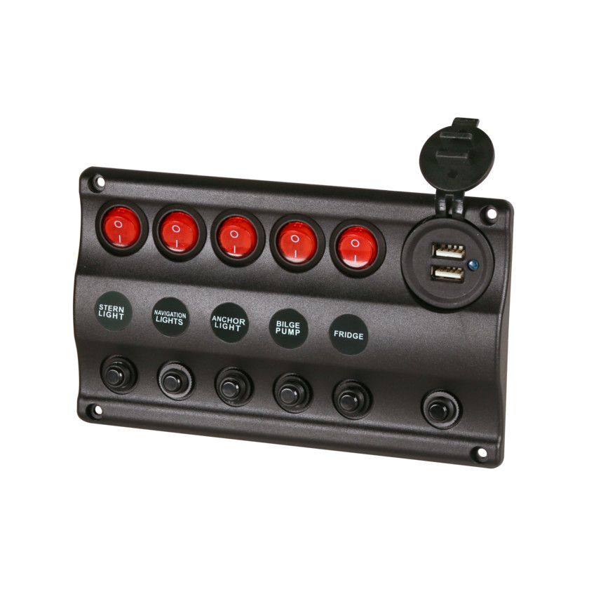 Splashproof 12V switch panel offering 5 switches with circuit breaker protection on each switch plus the convenience of dual USB ports.