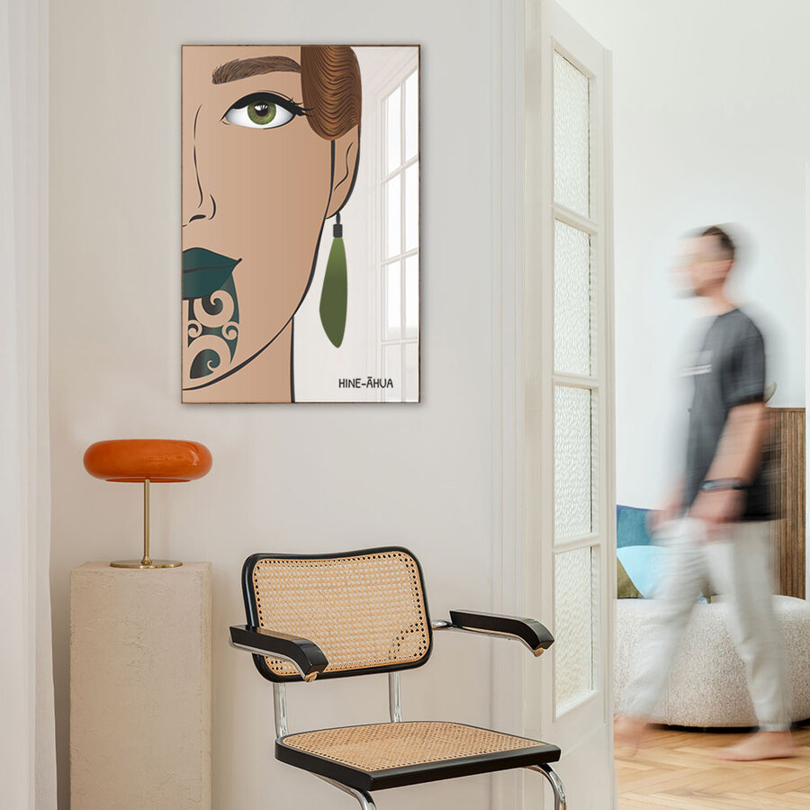 Hine-Āahua Évora Cedrick: The Close Up is a powerful contemporary Māori art print that invites you into the soul of its subject. Zoomed in and tightly framed, this version of the original portrait offers a deeper emotional connection celebrating mixed-heritage at its best. (Pictured: Size A1)