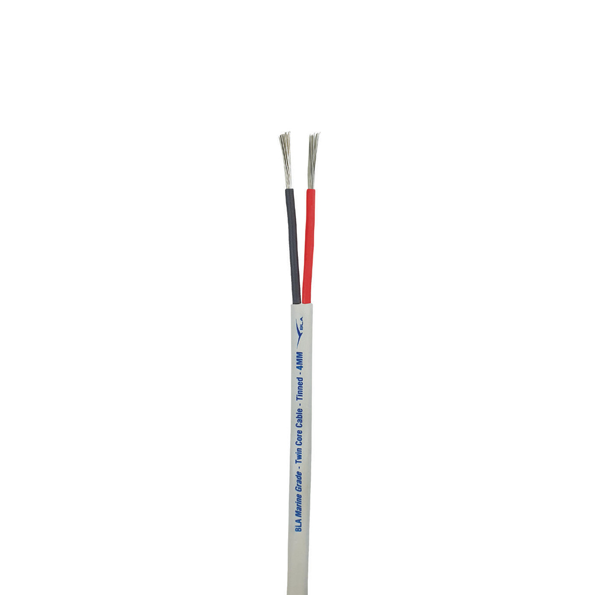 Marine quality, twin core low voltage wiring with external sheath for extra protection in vulnerable applications. V90 PVC insulation and sheath to AS/NZS 3808, tin coated copper wire conductor to AS/NZS 1125. Red/black core with white outer sheath, printed with sizing and metre marks.