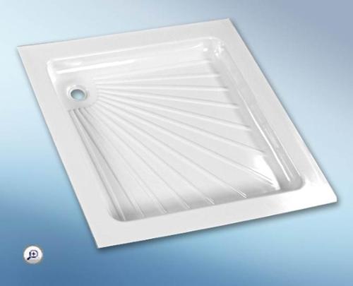 Shower tray with side edge, especially suitable for installation in caravans and motor homes, for shower cabins and custom-made. The lateral edge of the shower tray is underlaid. With drain under the vehicle floor. Incorporated grooves reduce the risk of slipping. Made of sturdy, smooth and easy-to-clean plastic.