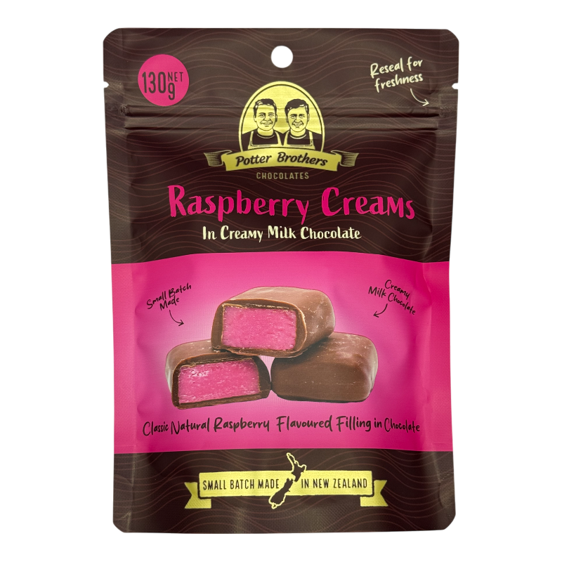 Discover Potter Brothers Raspberry Cream in Creamy Milk Chocolate — a New Zealand-made treat featuring classic natural raspberry flavoured filling in milk chocolate.