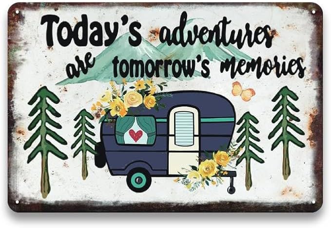 Print: caravan with pine trees, flowers and mountains and writing "Today's adventures are tomorrow's memories".