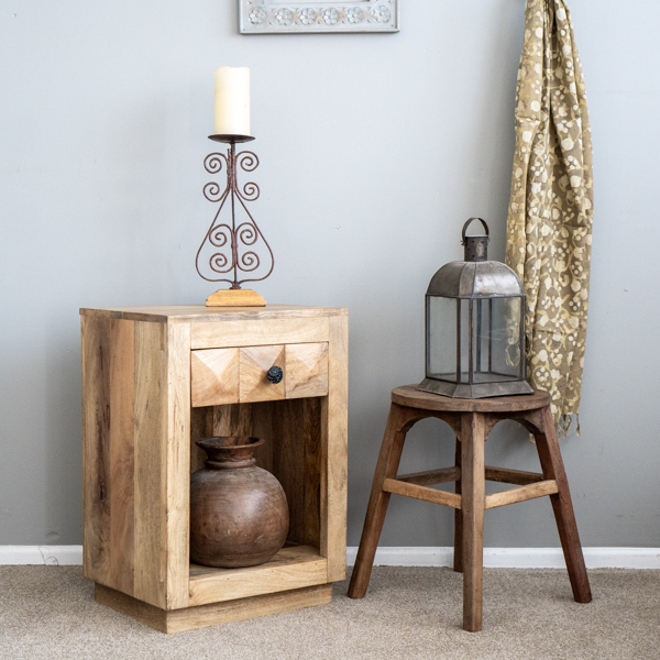 A wonderful bohemian style bedside table with beautifully detailed hand carving work.