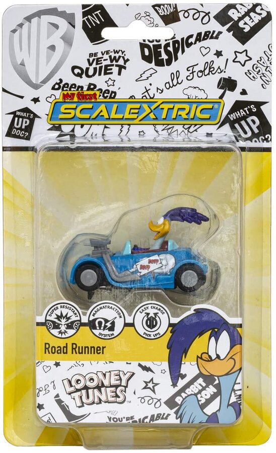 Looney Tunes Road Runner solo car. This solo vehicle is an ideal collectable and an addition to the Micro First Scalextric Looney Tunes Set which contains Bugs Bunny and Daffy Duck. This solo vehicle is compatible with all 9V Micro Scalextric track systems.