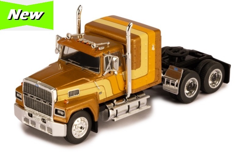 Ford LTL 9000 heavy-duty truck, with sleeper for long-haul runs. Built to compete with the GMC General, Kenworth W900, Mack Super-Liner, and Peterbilt 359, the LTL 9000 was more affordable for many. It's long bonnet and front axle position allowed for larger engines and provided plenty of servicing space. Diecast metal cab and chassis, and plastic parts. Detail includes number plate, and "Blue Oval". Wheels rotate but front wheels are non-posable. Classic 70's bronze, orange, and beige livery. Approx. 12cm x 4.5cm x 5.5cm (4.75" x 1.75" x 2.25"). Comes in an acrylic display case.