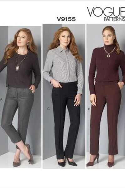 MISSES'/MISSES' PETITE PANTS: Semi-fitted, tapered pants have contour waistband with continuous binding, and side-front pocket variations. A: Back hemline slit and cropped capri-length. A, B: Inside button on waistband, fly zipper, and side-back seams. C: Inside button/bias loop on waistband, stitched crease, and invisible side zipper.