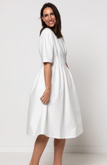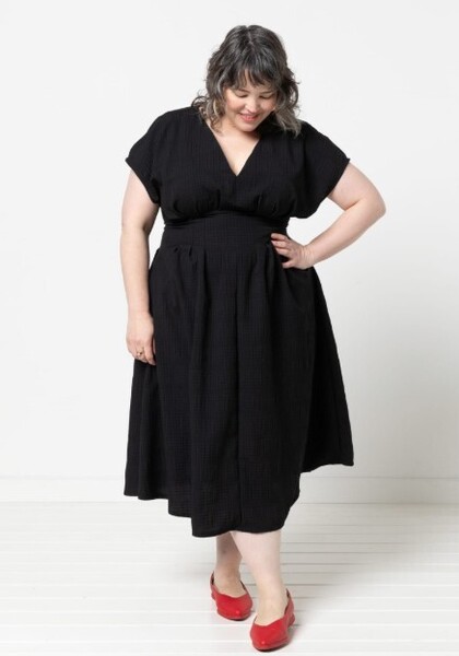 The Bronte Woven Dress sewing pattern features round or V-neck options, sleeveless or elbow-length sleeves, a pleated waist with slight A-line mid-length skirt and optional inseam pockets.