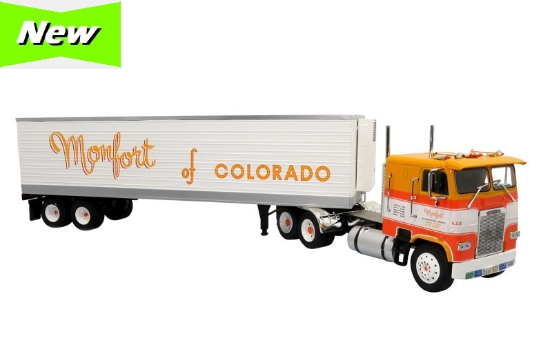 Freightliner FLA COE. Monfort of Colorado heavy-duty tractor truck with reefer. The Tractor unit is diecast metal with some plastic parts, and is approx. 16cm x 6.5cm x 8.5cm (6.25" x 2.5" x 3.25"). The reefer trailer is made of plastic and is approx. 29cm x 6cm x 9cm (11.5" x 2.5" x 3.5"). The total length of the connected semi is approx. 38.5cm (15"). Rubber tyres and rotating (non-steerable) wheels. No opening parts. Part of the Iconic Replicas Vintage Heavy Haul Truck Collection.