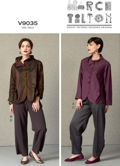 Misses' Jacket and Pants: Loose-fitting, unlined Jacket has raised neckline, slightly extended shoulders, mock bands, front button variations, side front pockets, machine tacking forming pleat/mock pocket (back) and long sleeves. A: stitched hem on sleeves. B: fold-back cuffs. Note: no provisions provided for above or below waist adjustment. Pants (loose-fitting through) hips have waistband, yokes, side front/side back seams, no side seams, pleated lower edge, stitched hems, and fly zipper closing. All have Topstitching.