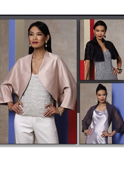 Loose-fitting jackets A, B, C with no closures. A: lined with facing, dolman sleeves, back collar extending into shoulders. B: above waistline, collar, yoke and gathers. C: sheer, drape (pleated in back) and sleeve bands.
