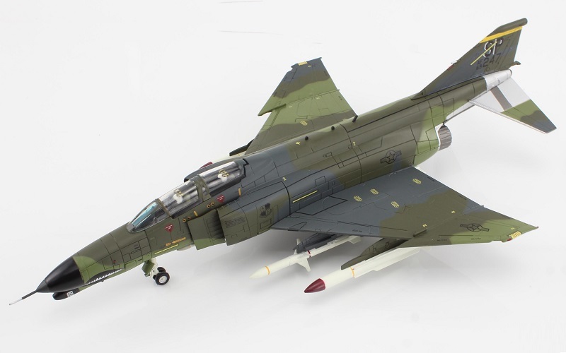 McDonnell Douglas Phantom F-4G "Wild Weasel" 69-0247, 52nd Tactical Fighter Wing, Spangdahlem NATO Air Base, Germany. Two-seat, twin engine, all-weather long-range supersonic jet interceptor and fighter-bomber. F-4's were used extensively by the US in the Vietnam war. Roles included ground attack, air superiority fighter, and aerial reconnaissance. Wild Weasel is the code name for aircraft equipped with anti-radiation missiles, used to destroy enemy radar and SAM installations. A Wild Weasel pilot baits an enemy into targeting them with their radar, then traces those radar signals back to their source. Thus allowing the Weasel or its allies to target and destroy the enemy facility. Highly detailed diecast with some plastic parts. Opening forward and rear canopies which reveal the cockpit detail. Removable pilot figures, and selectable ordnance. Landing gear can be configured up or down. Approx. 26cm x 16.5cm (10.25" x 6.5"). Comes with a display stand.