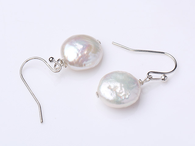 These gorgeous drop earrings feature freshwater button pearls in a classic, slightly flattened coin shape. Each pearl measures approximately 10mm and displays a smooth, high-luster surface with a soft white body colour and delicate iridescent pink and silver overtones. Suspended from polished 925 sterling silver French hooks, they offer just the right amount of movement and sophistication for day-to-night wear.