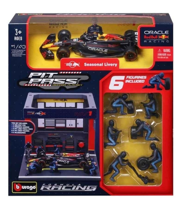Interactive pit stop set: includes a pit garage, tools, crew figures, and accessories for realistic play