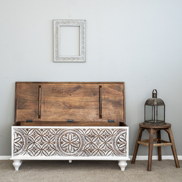A decorative handcrafted blanket box with wonderful hand carved timber detailing.