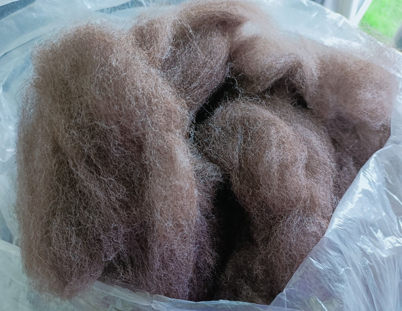 100g of carded fibre by Vienna. Micron 24 micron. This is a dark brown which has roaned out and has lots of grey fibres throughout the fleece.