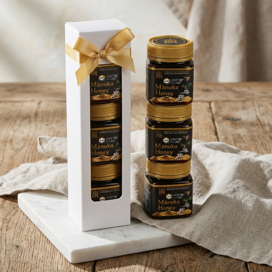 Presenting our most sought-after honey, reserved for those who seek the finest. This gift box holds three 110g jars of Mountain Gold Manuka Honey with a potent 10+ UMF rating. Sourced from the most remote, untouched regions of New Zealand, this honey offers a deeper, more complex flavor and enhanced properties. The ultimate gift for the connoisseur, the health-conscious, or as a superlative corporate present.