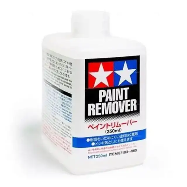 This multi-purpose liquid is capable of removing acrylic-, enamel- and lacquer-based paints, including paints for use on polycarbonate. It is kind to model parts surfaces, and does not cause clouding when used on polycarbonate, and can also be used to remove metal plating.