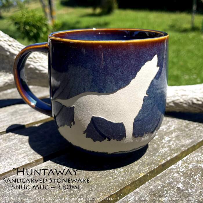 Hunting4Art's beautiful sandcarved stoneware 'Snug Mug' range is of the highest quality and engraved with Summer Brook's famous artworks! Each piece is sand carved through the glaze layer, exposing the creamy white stoneware beneath. A truly sensory experience as you trace the design with your fingertips while enjoying your favourite hot beverage.....FYI - It's coffee in our house!