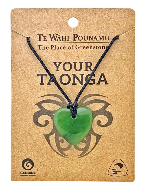 Genuine New Zealand Pounamu pendant in the shape of a heart, hanging on a strong, adjustable braided cord.