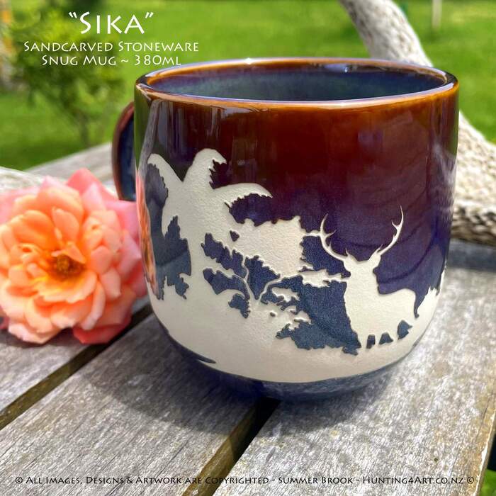 An inquisitive Sika stag stands tall in a clearing amongst the thick New Zealand bush. This beautifully crafted hand sandcarved stoneware mug is a great way to start your day off right!
