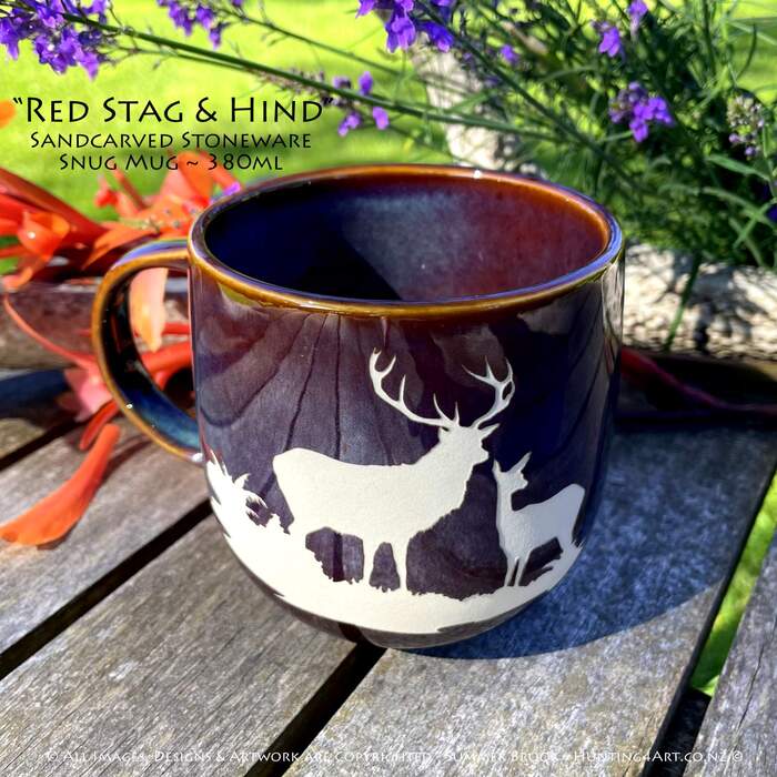 A magnificent NZ Red stag & hind stand proud. This beautifully crafted hand sandcarved stoneware mug is a great way to start your day off right!