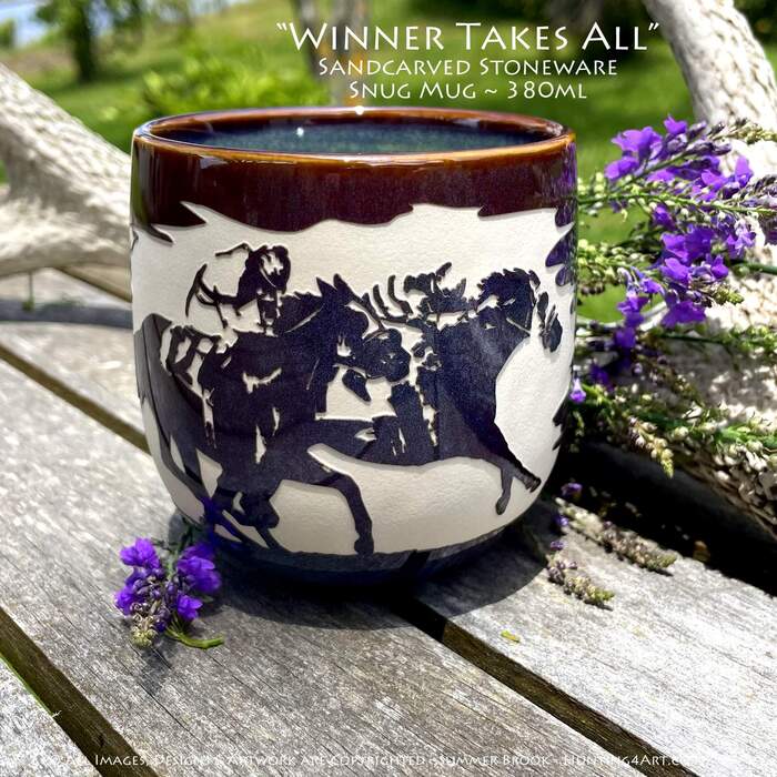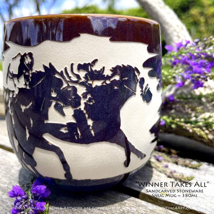 Two determined Thoroughbred race horses battle it out on the track! This beautifully crafted hand sandcarved stoneware mug is a great way to start your day off right!