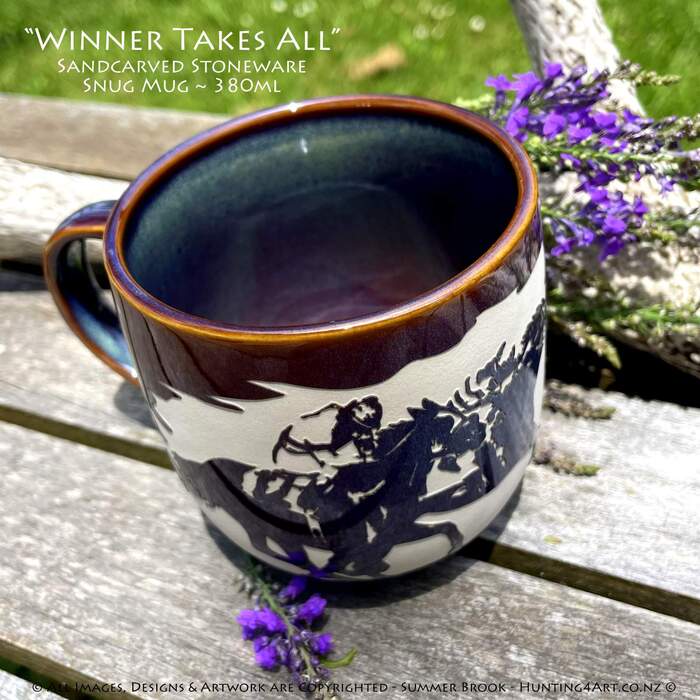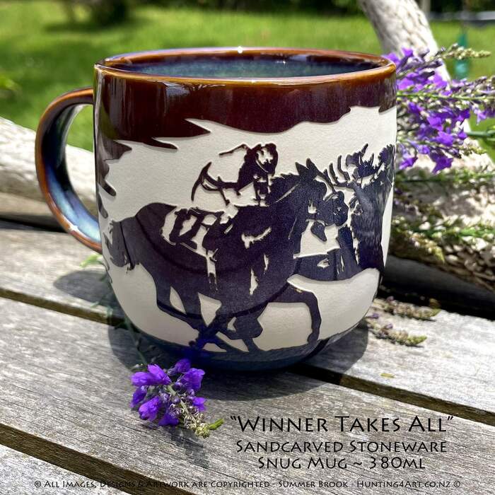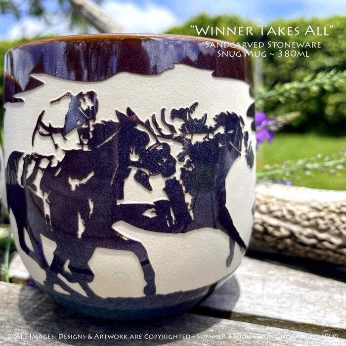 Hunting4Art's beautiful sandcarved stoneware 'Snug Mug' range is of the highest quality and engraved with Summer Brook's famous artworks! Each piece is sand carved through the glaze layer, exposing the creamy white stoneware beneath. A truly sensory experience as you trace the design with your fingertips while enjoying your favourite hot beverage.....FYI - It's coffee in our house!
