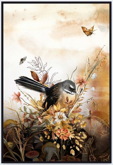 Presented in a matt black box frame, this whimsical print depicts our cheeky piwakawaka (fantail) nestled in an arrangement of flowers. Subtle in its sophistication, this art work will add a touch of class to whichever room it ends up in.