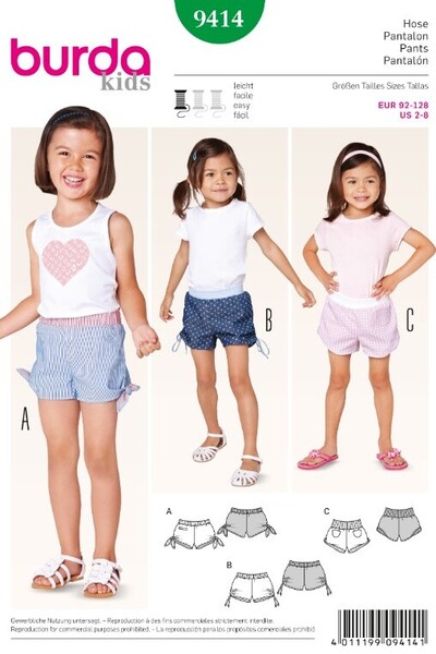 Narrowly cut summer shorts. A with cheekily knotted legs and reverse side of the elasticated waist turned to the outside. Shorts B and C with comfortable ribbed waistband. B with gathered sides, C nicely entwined.