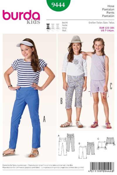 Casual hipsters for midsummer, with side zipper and shaped waistband. Long variant A with patched front pockets. Capri pants B with side slits. Shorts C with tie bands to be knotted.